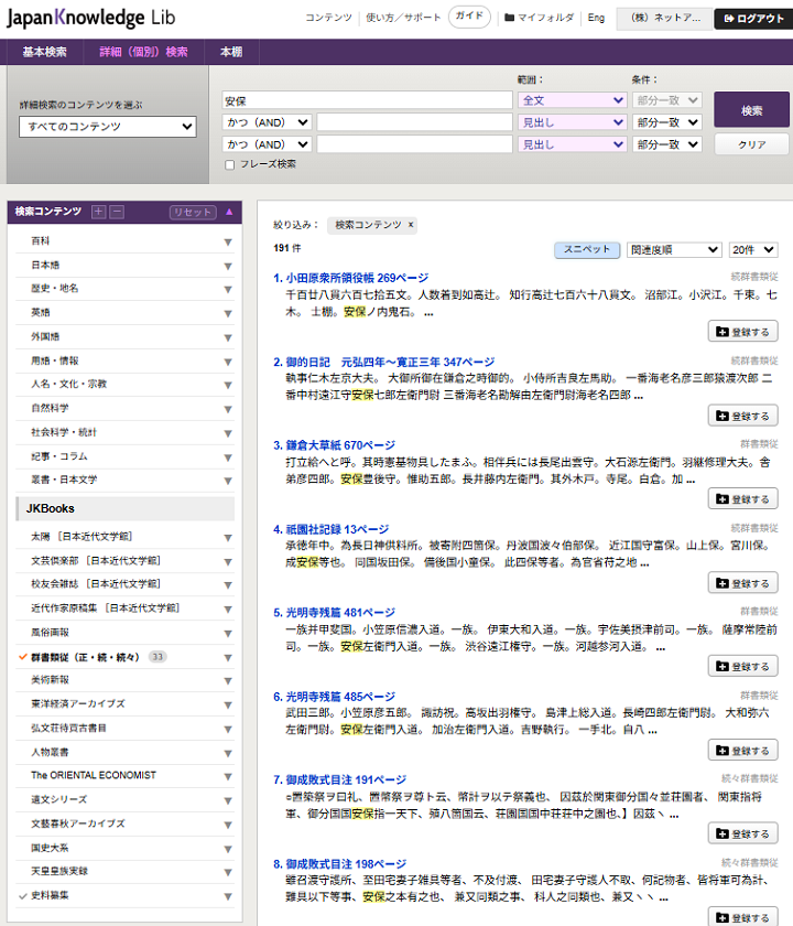 さて、「安保」というキーワードで『史料纂集 古記録編』と『群書類従』を検索してみると、191件出てきます。これは古文書では見えない世界であり、これが見えてくるというのが歴史研究をする上で大きな武器になるということは、言わずもがなというところです。