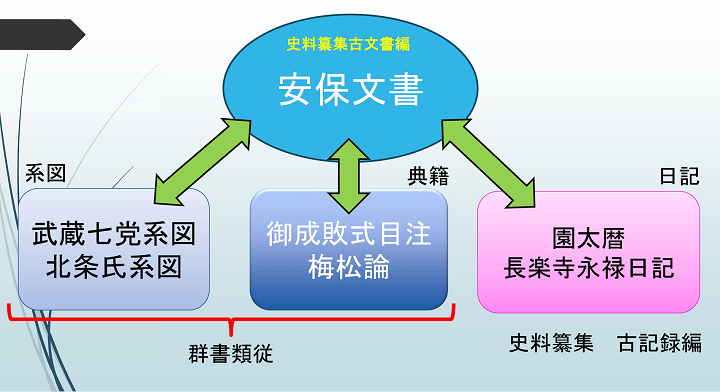 もちろん『安保文書』だけでも魅力的な文書がたくさんあって、読み解いていくことの楽しさがありますが、たとえば『安保文書』に出てくる人物を『群書類従』の系譜部・系図部で調べていくと、安保氏というのが武蔵七党という大きな武士団の中の一つのブランチであることが分かります。また、武蔵七党の系図をみていくと安保氏の関係者がたくさん分かってきます。